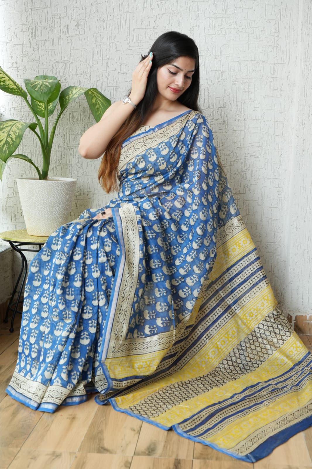 Pure Hand Block Printed Chanderi Silk Saree with Printed Blouse.