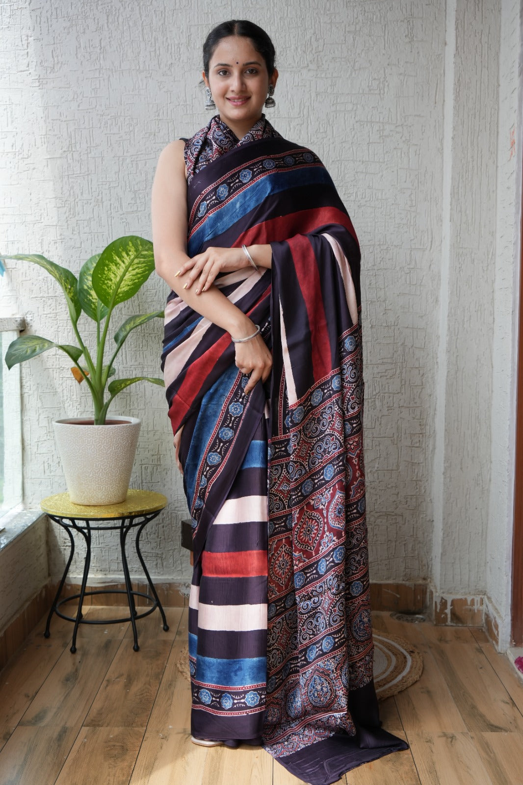 Exlcusives - Natural Dye Vegetable Hand Block Ajarkh Print Pure Modal Silk Saree