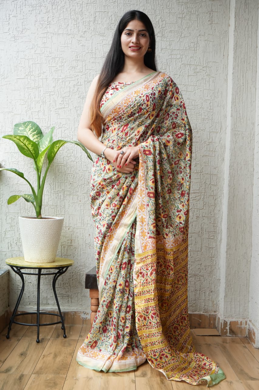 Jaipuri Hand Block Bagru Printed Maheshwari Silk Saree With Blouse (MSS34)